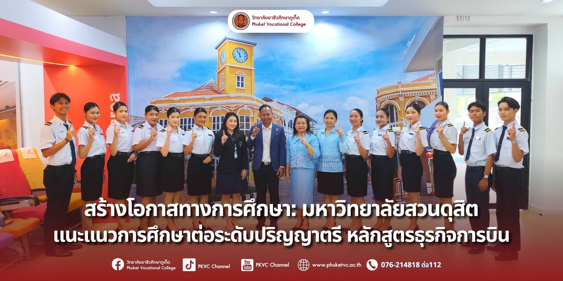วันที่ 15 สิงหาคม 2568 มหาวิทยาลัยสวนดุสิต ศูนย์การศึกษาหัวหิน ที่ให้เกียรติเข้ามาแนะแนวการศึกษาต่อในระดับปริญญาตรี หลักสูตรธุรกิจการบิน ให้แก่นักศึกษาแผนกวิชาธุรกิจการบิน ณ วิทยาลัยอาชีวศึกษาภูเก็ต
