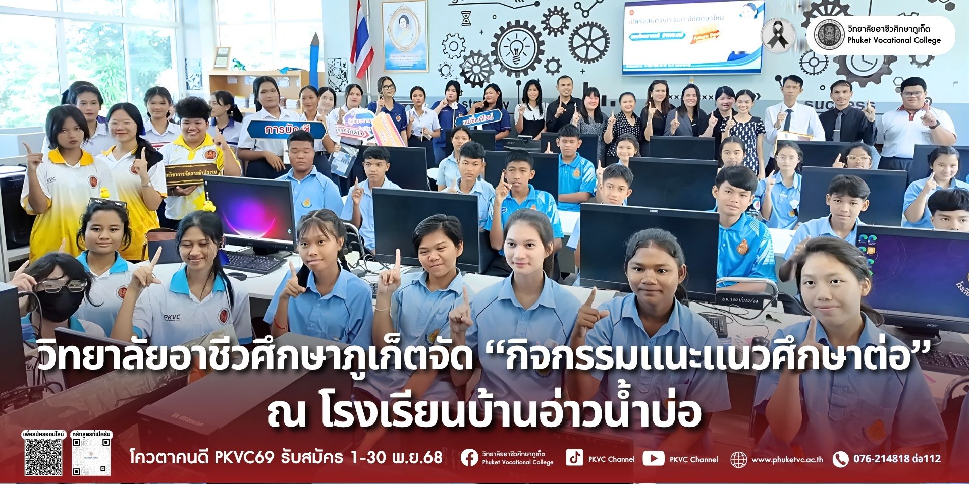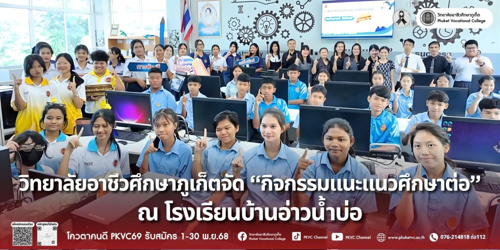 วันพฤหัสบดีที่ 13 พฤศจิกายน 2568 วิทยาลัยอาชีวศึกษาภูเก็ตได้จัด “กิจกรรมแนะแนวศึกษาต่อ” ณ โรงเรียนบ้านอ่าวน้ำบ่อ