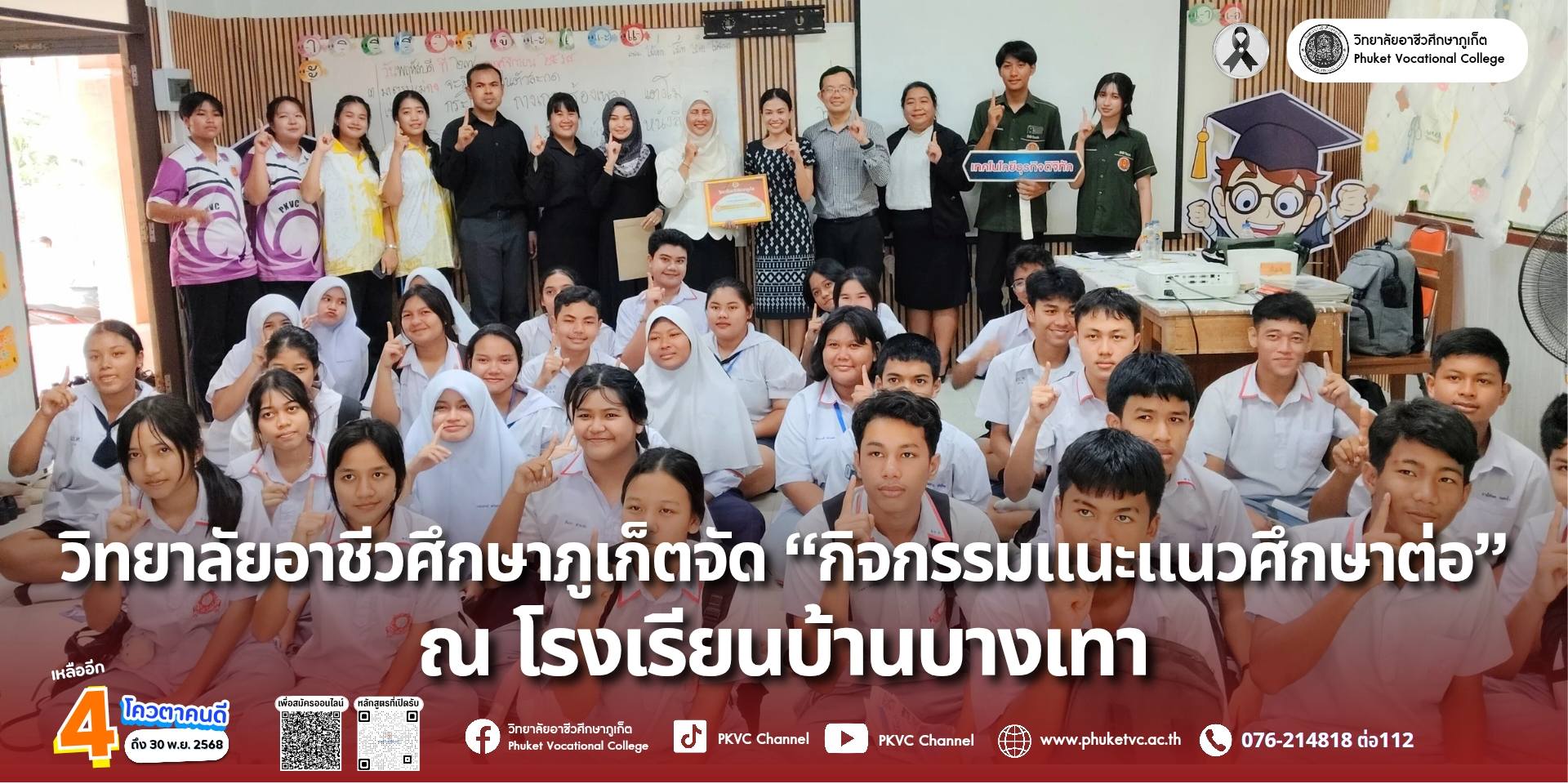วันพฤหัสบดีที่ 27 พฤศจิกายน 2568 วิทยาลัยอาชีวศึกษาภูเก็ตจัด “กิจกรรมแนะแนวศึกษาต่อ” ณ โรงเรียนบ้านบางเทา