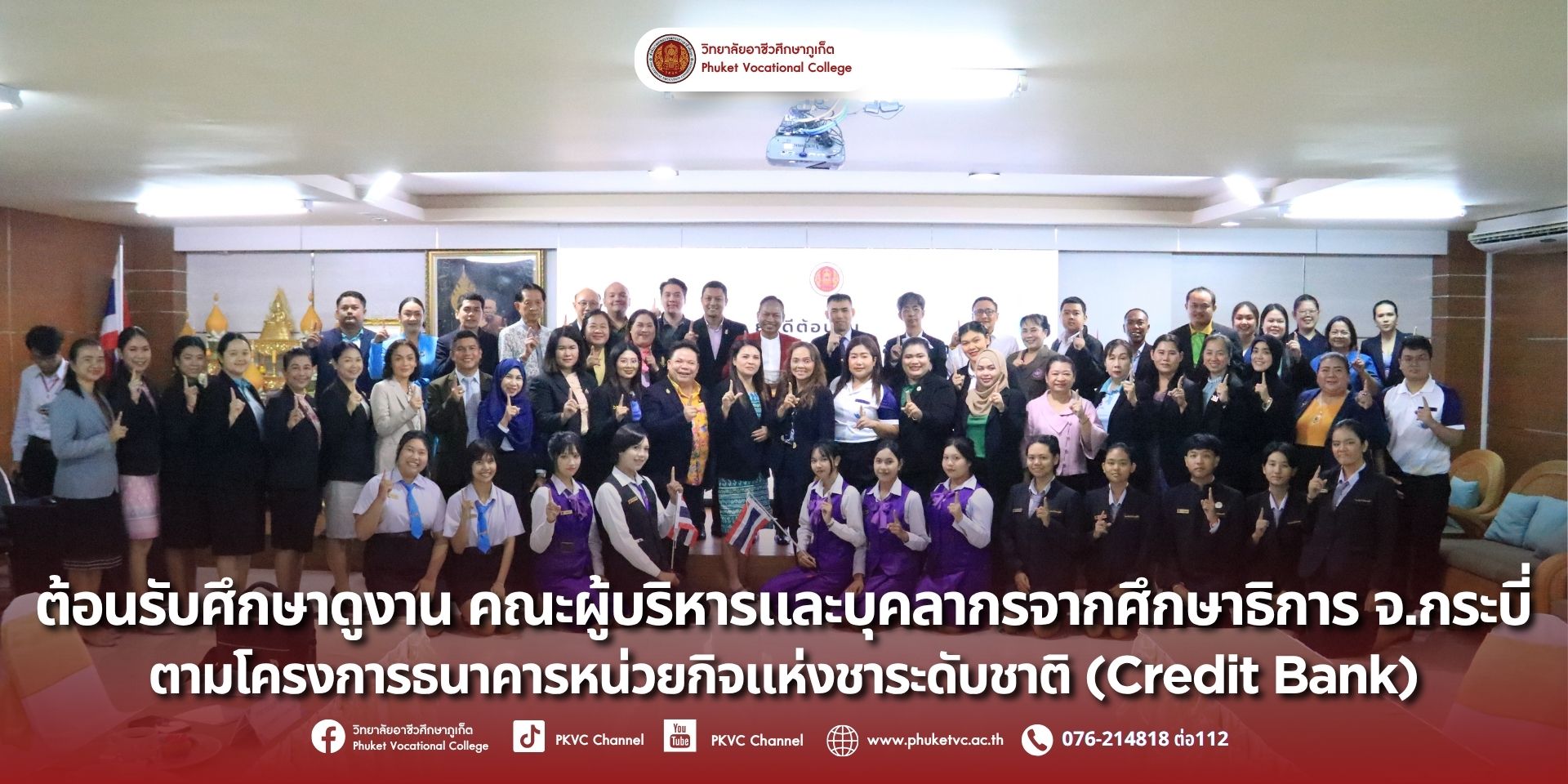 วันพุธที่ 1 ตุลาคม 2568 วิทยาลัยอาชีวศึกษาภูเก็ต ขอต้อนรับคณะศึกษาดูงาน คณะผู้บริหารและบุคลากรจากศึกษาธิการ จังหวัดกระบี่ เข้าศึกษาดูงาน รูปแบบการจัดการเรียนการสอนตามโครงการธนาคารหน่วยกิจแห่งชาติ (Credit Bank) ณ ห้องประชุมราไวย์