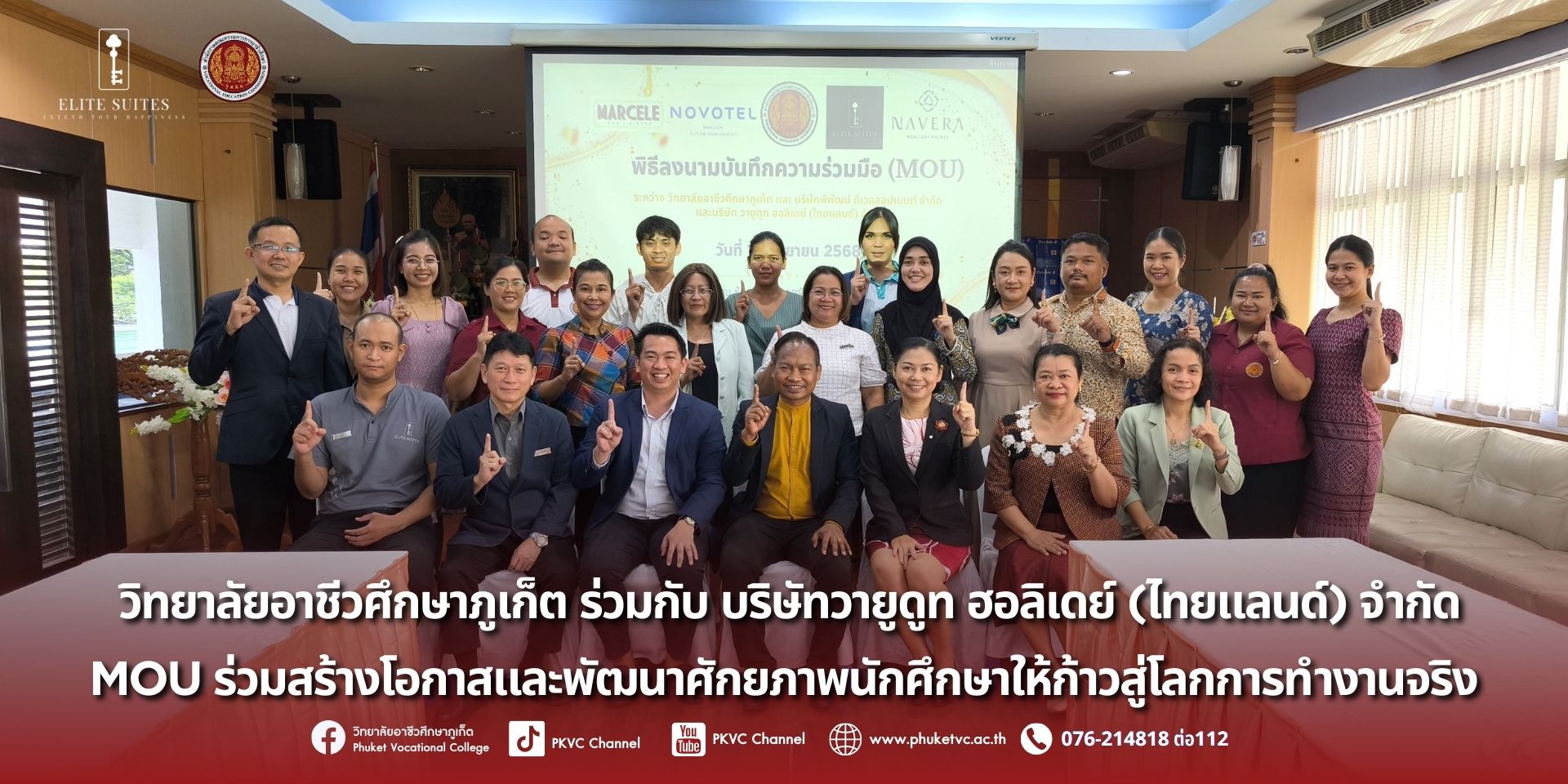 วันพุธที่ 17 กันยายน 2568 ดร.วิทยา เกตุชู ผู้อำนวยการวิทยาลัยอาชีวศึกษาภูเก็ตพร้อมด้วยคณะผู้บริหาร ครู และบุคลากรที่เกี่ยวข้องร่วมพิธีลงนามบันทึกความร่วมมือทางการศึกษา (MOU) ระหว่างวิทยาลัยอาชีวศึกษาภูเก็ต และ บริษัทวายูดูท ฮอลิเดย์ (ไทยแลนด์) จำกัดจำกัด ณ ห้องประชุมไตรตรัง อาคารรัษฏา วิทยาลัยอาชีวศึกษาภูเก็ต