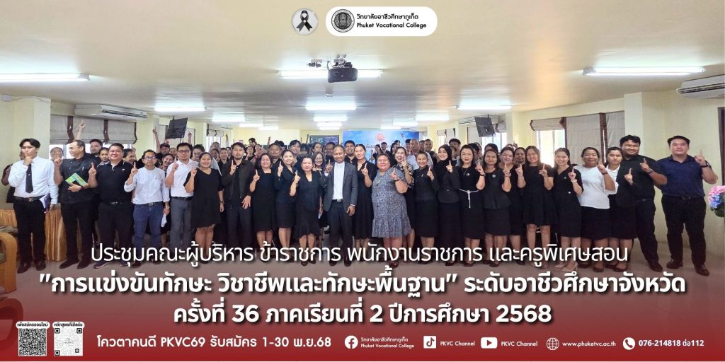 วันศุกร์ที่ 14 พฤศจิกายน 2568 วิทยาลัยอาชีวศึกษาภูเก็ตจัด ประชุมคณะผู้บริหาร ข้าราชการ พนักงานราชการ และครูพิเศษสอน “การแข่งขันทักษะ วิชาชีพและทักษะพื้นฐาน” ระดับอาชีวศึกษาจังหวัด ครั้งที่ 36 ภาคเรียนที่ 2 ปีการศึกษา 2568 ณ ห้องประชุมราไวย์ อาคาร R-Phuket Hotel วิทยาลัยอาชีวศึกษาภูเก็ต