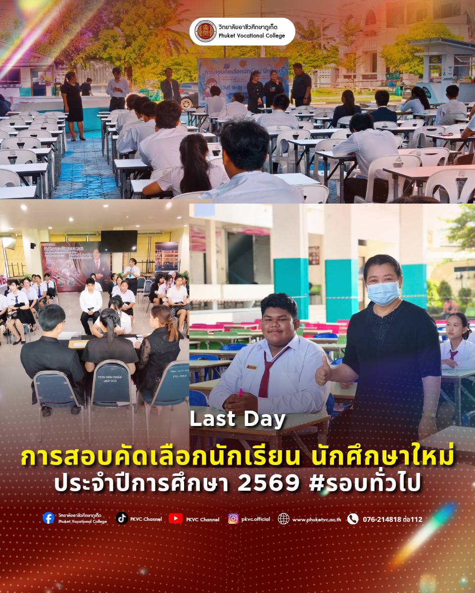 วันศุกร์ที่ 20 มีนาคม 2569 งานทะเบียน วิทยาลัยอาชีวศึกษาภูเก็ต จัดการสอบคัดเลือกนักเรียน นักศึกษาใหม่ รอบทั่วไป ระดับ ป.ตรี ประจำปีการศึกษา 2569