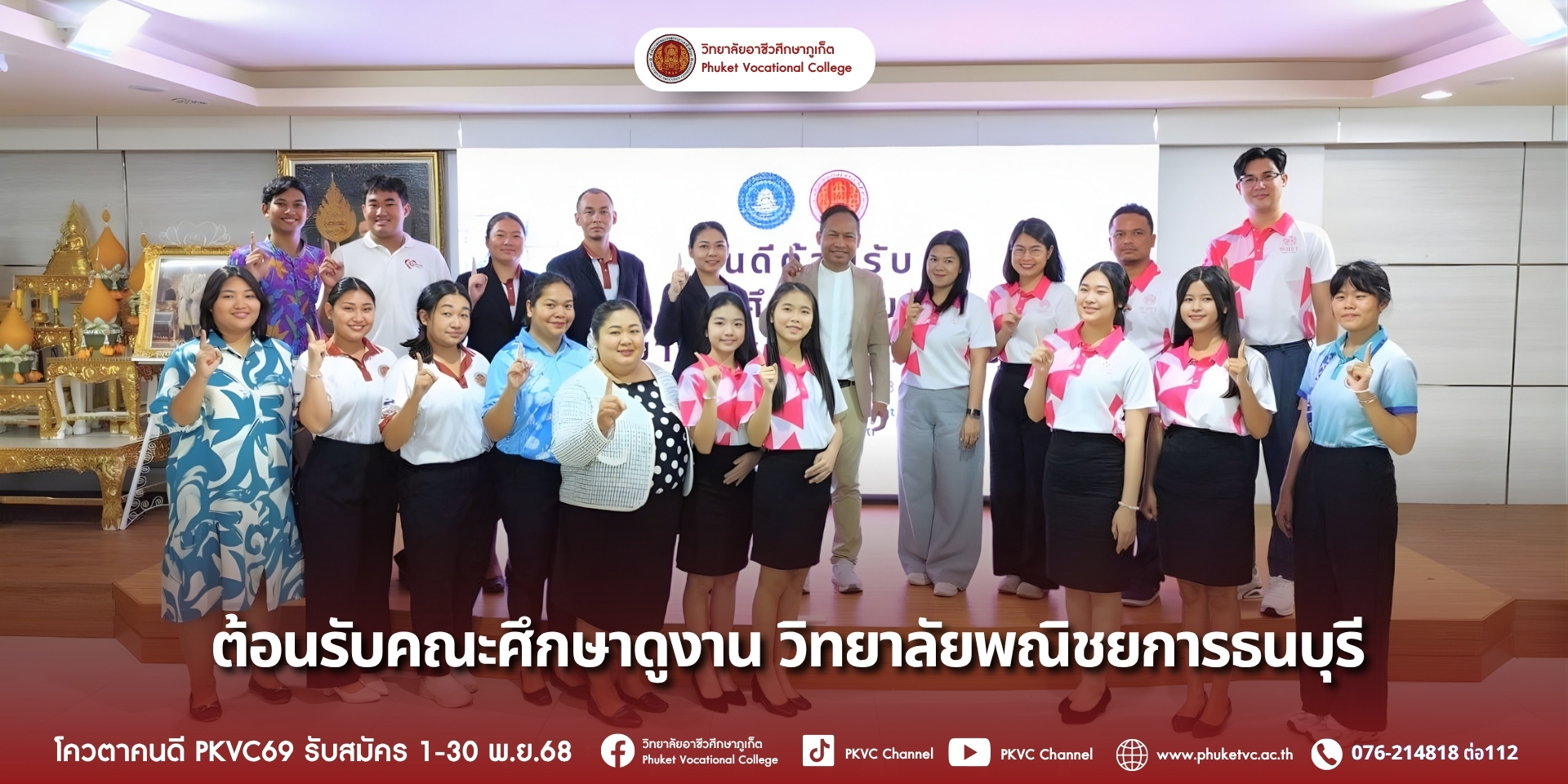 วันศุกร์ที่ 24 ตุลาคม 2568. วิทยาลัยอาชีวศึกษาภูเก็ต ต้อนรับคณะศึกษาดูงาน จากวิทยาลัยพณิชยการธนบุรี เข้าเยี่ยมชม แลกเปลี่ยนเรียนรู้ด้านการจัดการอาชีวศึกษา และสร้างความสัมพันธ์อันดีระหว่างสถาบัน