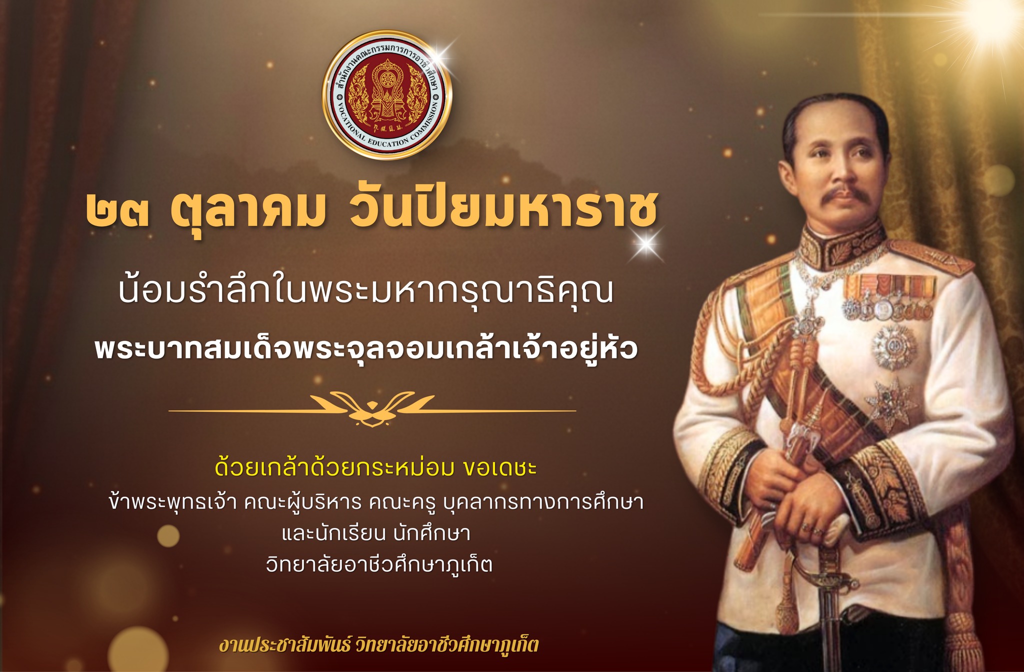 23 ตุลาคม วันปิยมหาราช น้อมสำนึกในพระมหากรุณาธิคุณพระบาทสมเด็จพระจุลจอมเกล้าเจ้าอยู่หัว. ด้วยเกล้าด้วยกระหม่อม ขอเดชะข้าพระพุทธเจ้า คณะผู้บริหาร คณะครู บุคลากรทางการศึกษา และนักเรียน นักศึกษาวิทยาลัยอาชีวศึกษาภูเก็ต