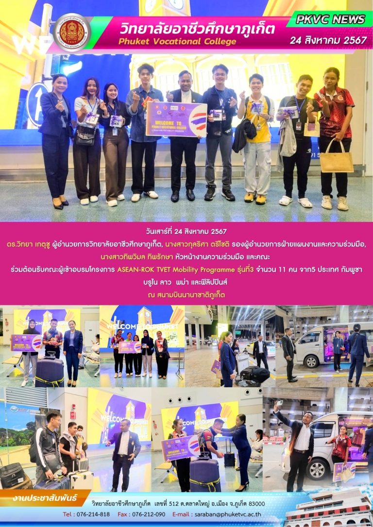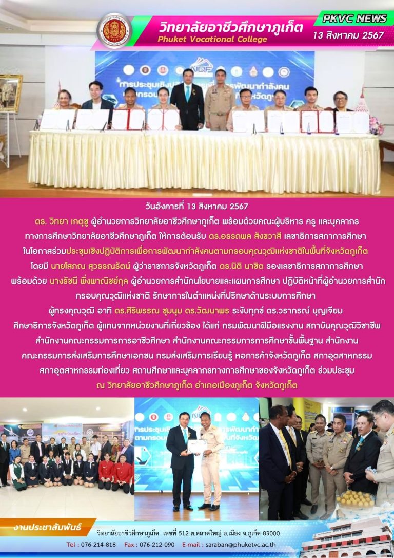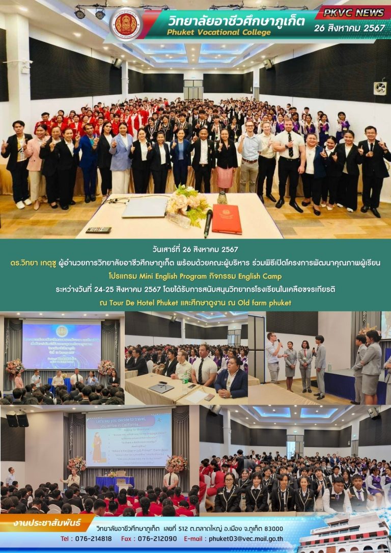 วิทยาลัยอาชีวศึกษาภูเก็ตมุ่งมั่นในการสร้างบุคลากรสายอาชีพที่มีคุณภาพ มีความรู้คู่คุณธรรม พร้อมทั้งพัฒนาศักยภาพผู้เรียนให้ก้าวทันเทคโนโลยี และมีทักษะที่ตอบโจทย์ตลาดแรงงานในยุคดิจิทัล เพื่อให้ทุกคนสามารถนำความรู้ไปใช้สร้างอาชีพ และพัฒนาชุมชนของตนเองให้เติบโตอย่างยั่งยืน