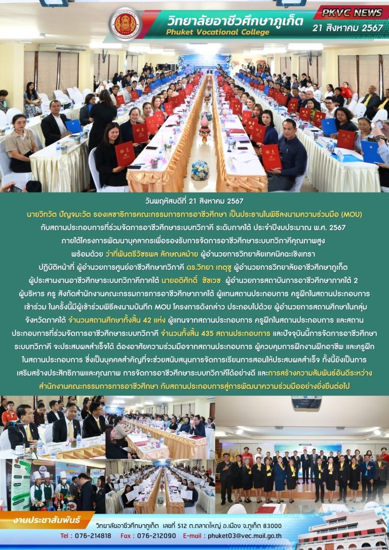 ในนามของวิทยาลัยอาชีวศึกษาภูเก็ต ขอสัญญาว่าจะมุ่งมั่นพัฒนาการศึกษาอาชีวะ ให้ก้าวไกลต่อไป เพื่อประโยชน์ของนักศึกษา และสังคมโดยรวม