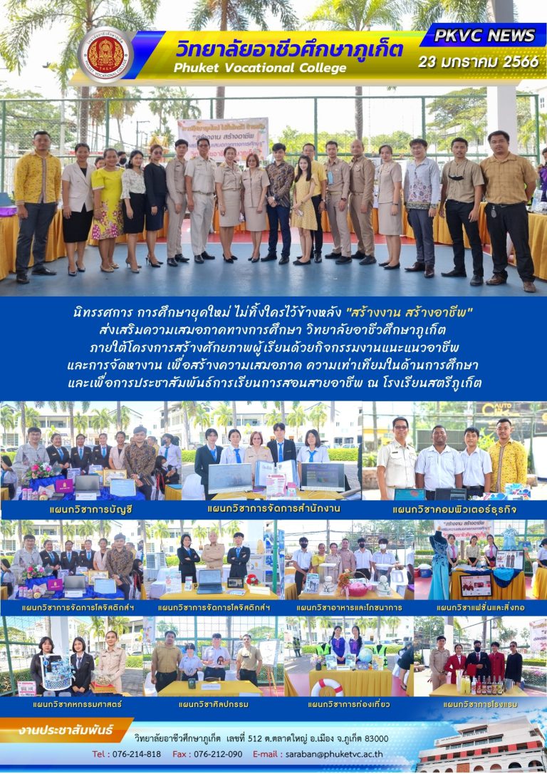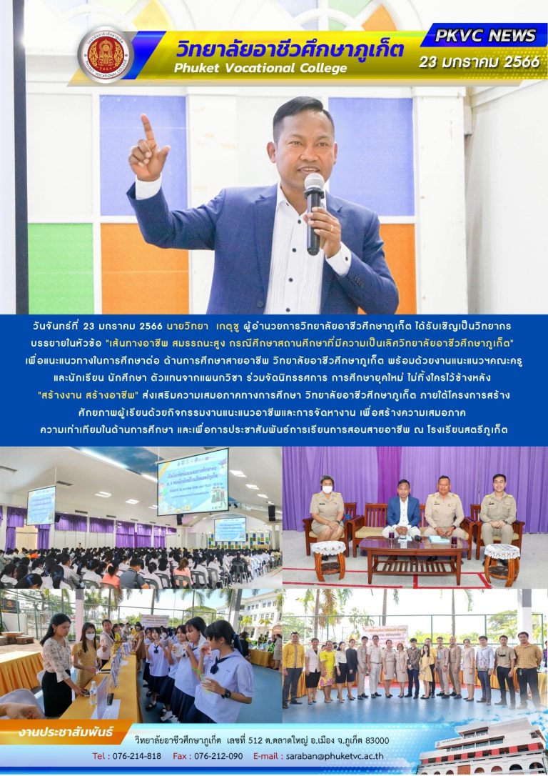 ในนามของวิทยาลัยอาชีวศึกษาภูเก็ต ขอสัญญาว่าจะมุ่งมั่นพัฒนาการศึกษาอาชีวะ ให้ก้าวไกลต่อไป เพื่อประโยชน์ของนักศึกษา และสังคมโดยรวม