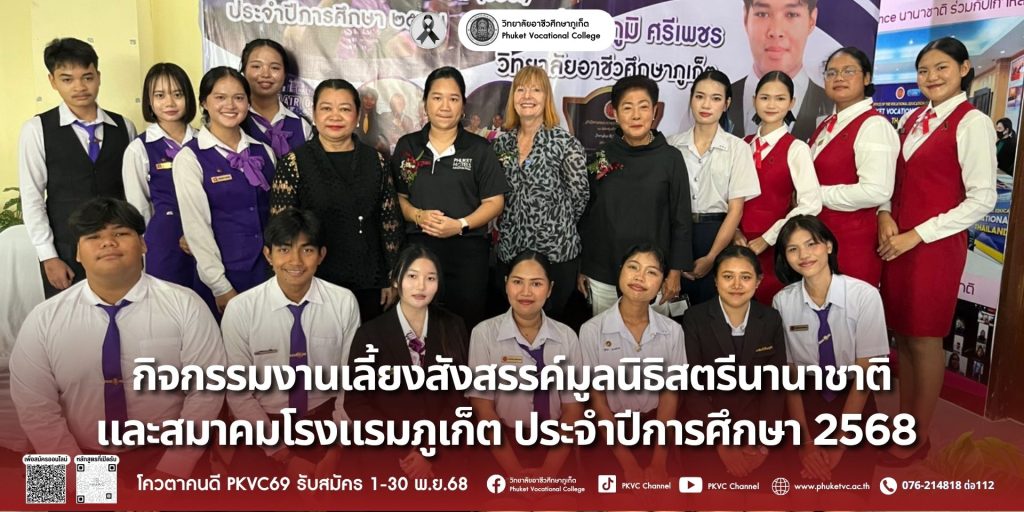 วันอังคารที่ 12 พฤศจิกายน 2568 วิทยาลัยอาชีวศึกษาภูเก็ต จัดกิจกรรมงานเลี้ยงสังสรรค์มูลนิธิสตรีนานาชาติและสมาคมโรงแรมภูเก็ต ประจำปีการศึกษา 2568 ณ ห้องประชุมสะพานหิน อาคาร R-Hotel Phuket วิทยาลัยอาชีวศึกษาภูเก็ต