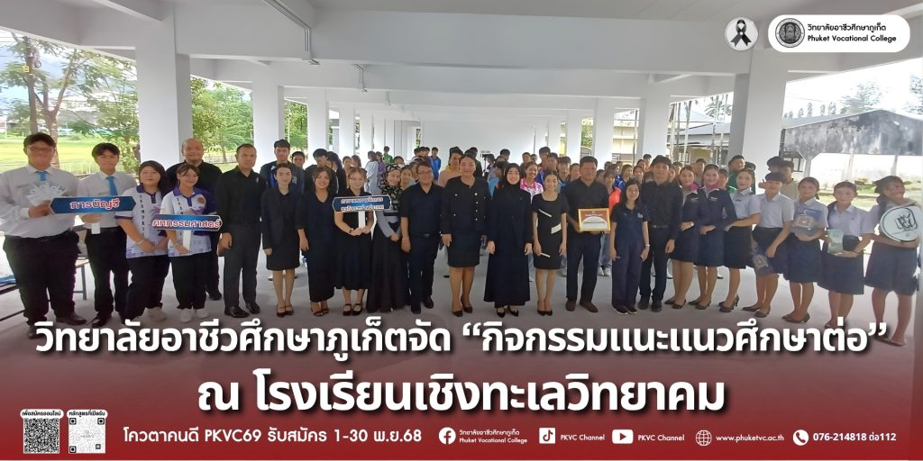 วันพฤหัสบดีที่ 20 พฤศจิกายน 2568 วิทยาลัยอาชีวศึกษาภูเก็ตได้จัด “กิจกรรมแนะแนวศึกษาต่อ” ณ โรงเรียนเชิงทะเลวิทยาคม