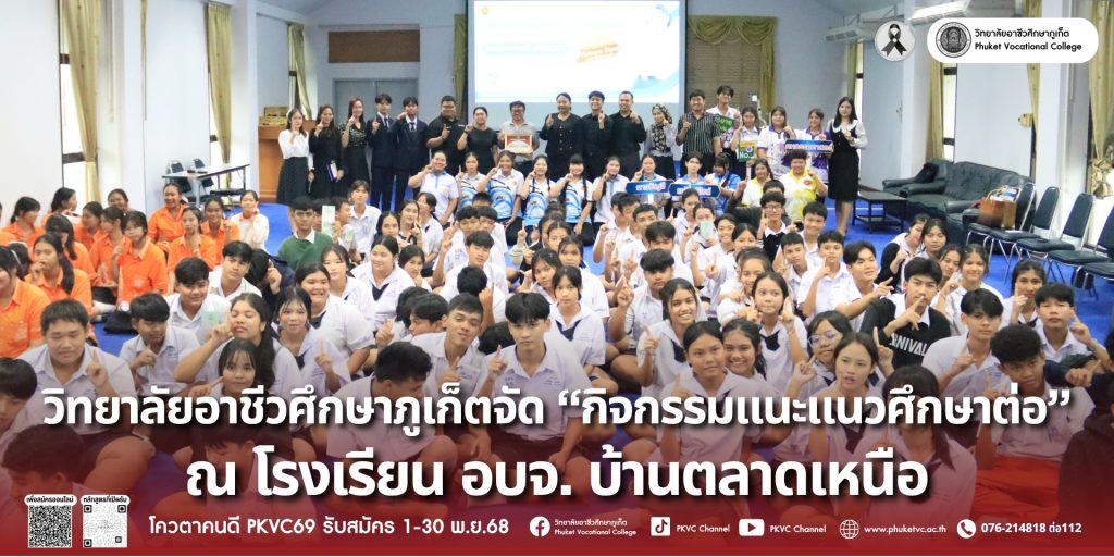วันพฤหัสบดีที่ 20 พฤศจิกายน 2568 วิทยาลัยอาชีวศึกษาภูเก็ตได้จัด “กิจกรรมแนะแนวศึกษาต่อ” ณ โรงเรียน อบจ. บ้านตลาดเหนือ