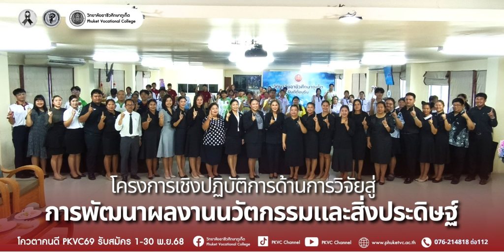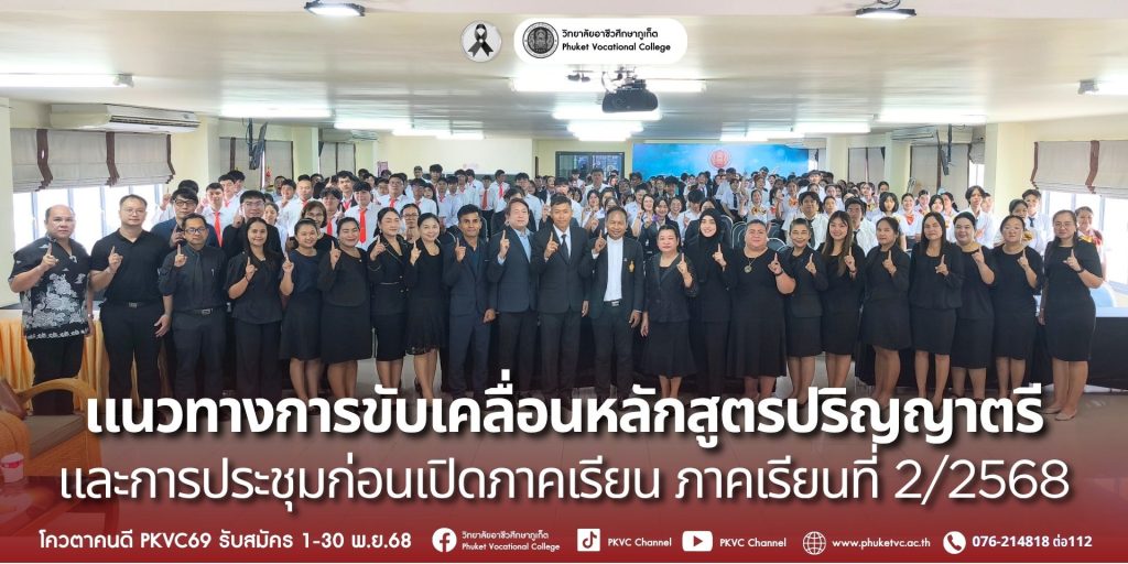 วันเสาร์ที่ 8 พฤศจิกายน 2568 วิทยาลัยอาชีวศึกษาภูเก็ต ได้จัดโครงการแนวทางการขับเคลื่อนหลักสูตรปริญญาตรี และการประชุมก่อนเปิดภาคเรียน ภาคเรียนที่ 2/2568 ณ ห้องประชุมราไวย์ อาคาร R-Phuke Hotel วิทยาลัยอาชีวศึกษาภูเก็ต