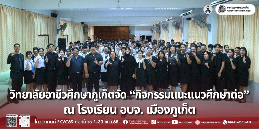 วันอังคารที่ 18 พฤศจิกายน 2568 วิทยาลัยอาชีวศึกษาภูเก็ตได้จัด “กิจกรรมแนะแนวศึกษาต่อ” ณ โรงเรียน อบจ. เมืองภูเก็ต