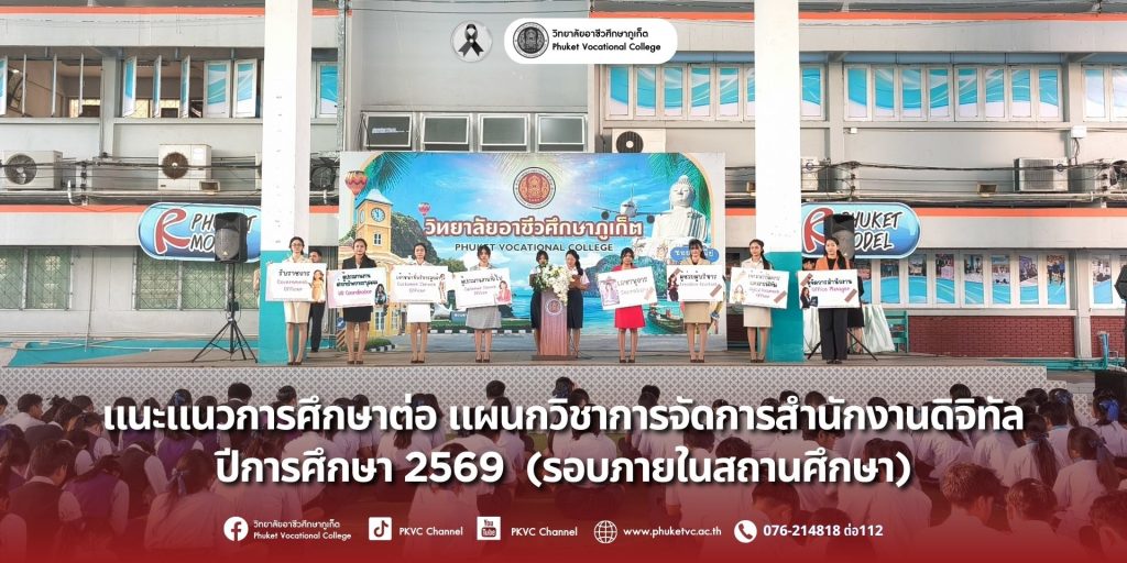 วันจันทร์ที่ 15 ธันวาคม 2568 วิทยาลัยอาชีวศึกษาภูเก็ต จัดกิจกรรมแนะแนวการศึกษาต่อ “แผนกการจักการสำนักงานดิจิทัล” รอบภายในสถานศึกษา ปีการศึกษา 2569