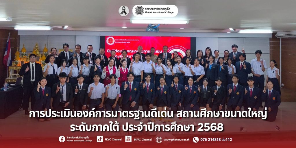 วันจันทร์ที่ 22 ธันวาคม 2568 วิทยาลัยอาชีวศึกษาภูเก็ต ต้อนรับคณะกรรมการ การประเมินองค์การมาตรฐานดีเด่น สถานศึกษาขนาดใหญ่ ระดับภาคใต้ ประจำปีการศึกษา 2568