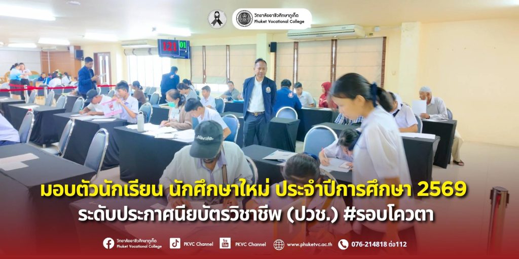 วันอาทิตย์ที่ 25 มกราคม 2569 วิทยาลัยอาชีวศึกษาภูเก็ต จัดกิจกรรมมอบตัวนักเรียน นักศึกษาใหม่ ประจำปีการศึกษา 2569 ระดับประกาศนียบัตรวิชาชีพ (ปวช.)