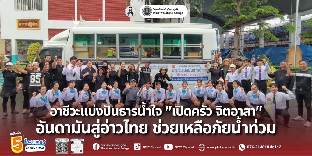 วันอังคารที่ 25 พฤศจิกายน 2568 อาชีวะภูเก็ตร่วมใจ อาชีวะแบ่งปันธารน้ำใจ “เปิดครัว จิตอาสา”อันดามันสู่อ่าวไทย ช่วยเหลือภัยน้ำท่วม ณ อำเภอหาดใหญ่ จังหวัดสงขลา