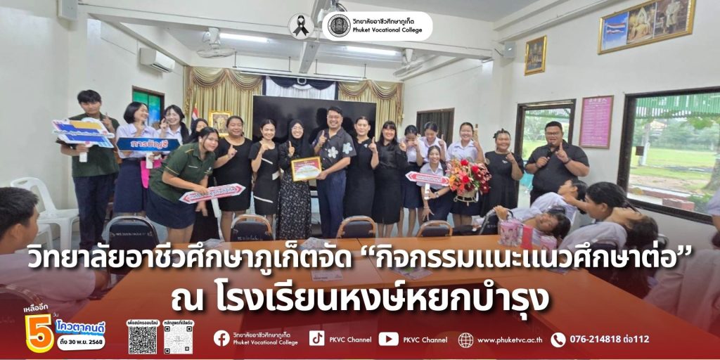 วันอังคารที่ 25 พฤศจิกายน 2568 วิทยาลัยอาชีวศึกษาภูเก็ตจัด “กิจกรรมแนะแนวศึกษาต่อ” ณ โรงเรียนหงษ์หยกบำรุง