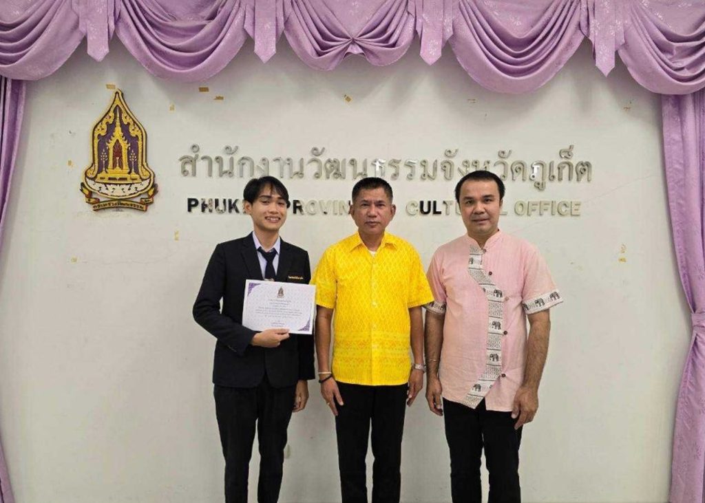 วันอังคารที่ 3 กันยายน 2567 นายยงยุทธ์ สุขกาล ครูแผนกวิชาอาหารและโภชนาการ นำนายปัณณวรรธ แซ่น่า นักศึกษาชั้น ปวส. 1/1 อาหารและโภชนาการ (minor) เข้ารับเกียรติบัตร จากสำนักงานวัฒนธรรมจังหวัดภูเก็ต ในโอกาศเข้าร่วมกิจกรรมส่งเสริมการอนุรักษ์วัฒนธรรม และเป็นจิตอาสาของสำนักงานวัฒนธรรมจังหวัดภูเก็ต โดย นายวิชัยยุทธ สิงห์สหาย วัฒนธรรมจังหวัดภูเก็ต เป็นผู้มอบ ณ สำนักงานวัฒนธรรมจังหวัดภูเก็ต