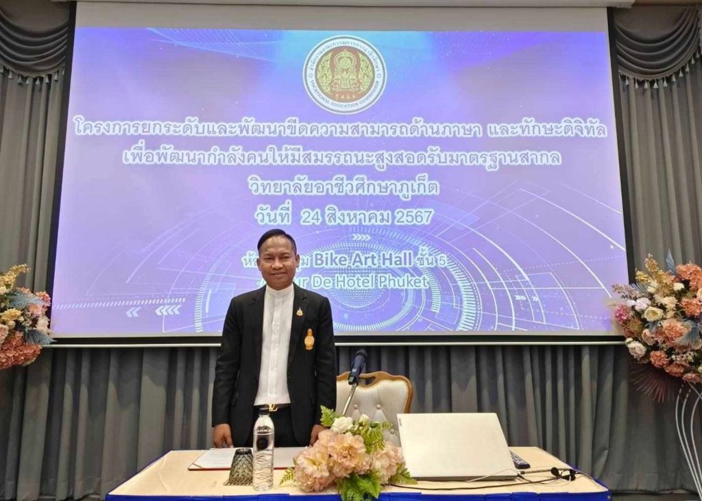 วันที่ 24-25 สิงหาคม 2567 ดร.วิทยา เกตุชู ผู้อำนวยการวิทยาลัยอาชีวศึกษาภูเก็ต ร่วมการอบรมเชิงปฏิบัติการ โครงการทักษะการบริหารกับข้อตกลงในการพัฒนางาน (PA) และการขอมีหรือเลื่อนวิทยฐานะที่สูงขึ้นสำหรับผู้บริหาร และร่วมเสวนา “ประสบการณ์และทักษะการบริหารบนความท้าทายและความก้าวหน้าในการขอมีหรือเลื่อนวิทยฐานะที่สูงขึ้น” สำหรับผู้เข้าร่วมการอบรมเชิงปฏิบัติการฯ ประกอบด้วย ผู้อำนวยการ รองผู้อำนวยการ สังกัดสำนักงานคณะกรรมการการอาชีวศึกษา ณ ห้องประชุมราไวย์ อาคาร R-Phuket Hotle วิทยาลัยอาชีวศึกษาภูเก็ต