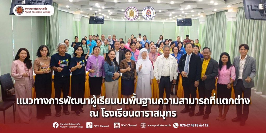 5 สิงหาคม 2568 วิทยาลัยอาชีวศึกษาภูเก็ต ได้เข้าร่วมการอบรมเชิงปฏิบัติการในหัวข้อ “การพัฒนาผู้เรียนแบบพื้นฐานของความแตกต่างระหว่างบุคคลโดยใช้ข้อมูล Finger Print ลายผิววิทยากับการบริหารจัดการสถานศึกษา” และ “การพัฒนาผู้เรียนตามแนวจินตคณิตในการสร้างเครือข่ายเยาวชน” ณ โรงเรียนดาราสมุทรภูเก็ต