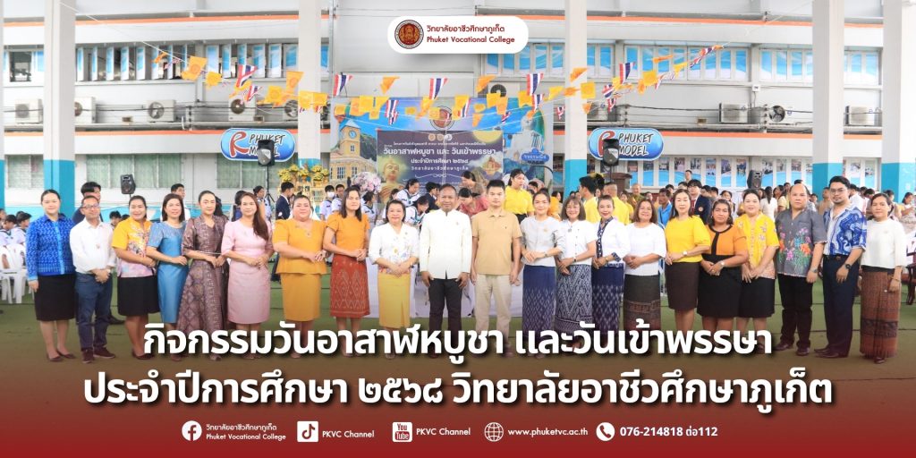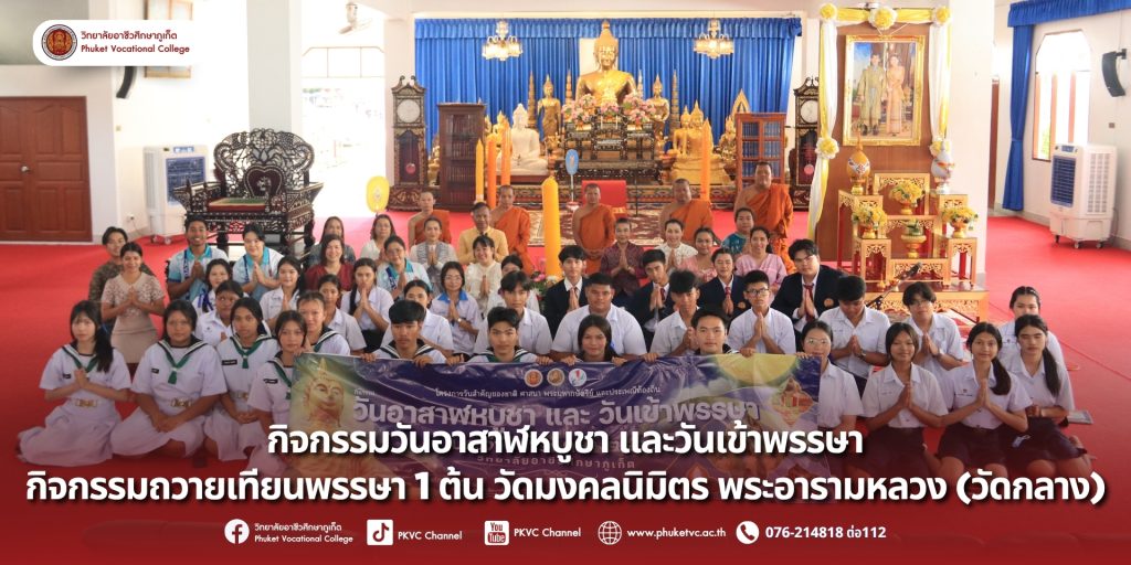 วันที่ 7 กรกฎาคม 2568 วิทยาลัยอาชีวศึกษาภูเก็ต ได้จัดกิจกรรมเนื่องในวันสำคัญทางพระพุทธศาสนา ณ ลานอาชีวะสัมพันธ์ เพื่อให้นักศึกษาและบุคลากรได้ร่วมสร้างกุศลและตระหนักถึงความสำคัญของประเพณีไทย และขอเชิญชวนร่วมอนุโมทนาบุญใน กิจกรรมถวายเทียนพรรษา ที่จะจัดขึ้นใน วันพุธที่ 9 กรกฎาคม 2568 ณ วัดสำคัญ 3 แห่ง วัดวิชิตสังฆาราม (วัดควน) วัดเจริญสมณกิจ (วัดหลังศาล) วัดพุทธมงคลนิมิตร ร่วมอนุโมทนาบุญและสืบสานประเพณีอันดีงามต่อไป