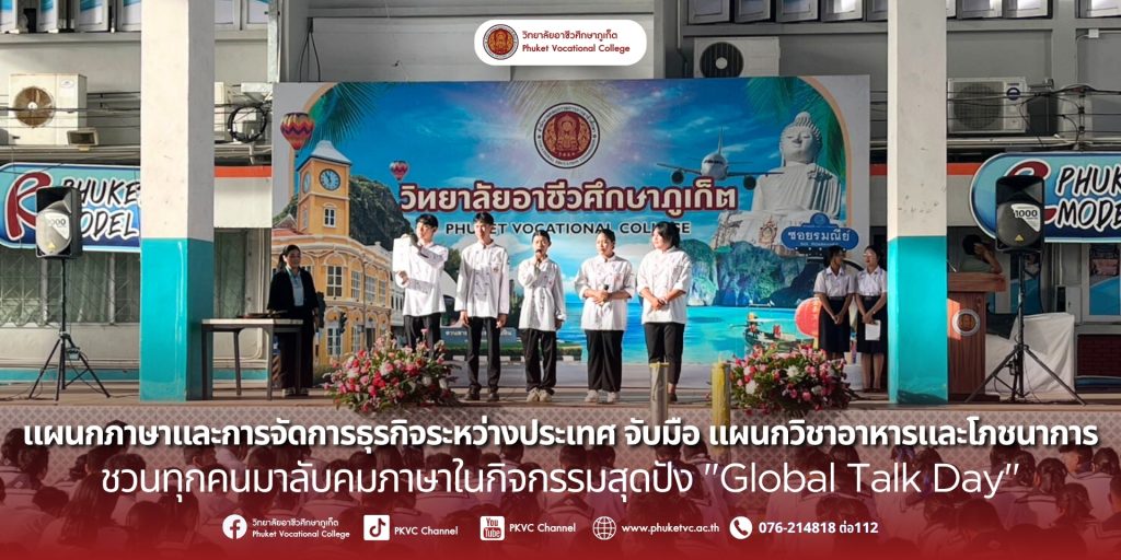 ทุกวันจันทร์ พุธ ศุกร์ แผนกภาษาและการจัดการธุรกิจระหว่างประเทศ วิทยาลัยอาชีวศึกษาภูเก็ต จะพาไปเรียนรู้ คำศัพท์ต่างประเทศ และ ประโยคเด็ดๆ ที่ใช้ได้จริงในชีวิตประจำวัน “Global Talk Day”! วันนี้ หอมอร่อยเป็นพิเศษ ได้เชฟรุ่นใหม่จาก แผนกวิชาอาหารและโภชนาการ มาร่วมปรุงความรู้คู่ภาษาทวันนี้: English in the Kitchenเรียนรู้ : คำศัพท์เกี่ยวกับอาชีพสายอาหาร (Food career vocabulary กิจกรรมหน้าเสาธง ตอนเช้า 7.30 น. เป็นต้นไป ณ ลานอาชีวะสัมพันธ์ วิทยาลัยอาชีวศึกษาภูเก็ต