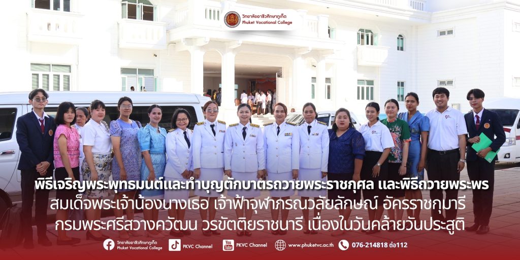 วันที่ ๔ กรกฎาคม ๒๕๖๘ วิทยาลัยอาชีวศึกษาภูเก็ต นำโดยคณะผู้บริหาร ครู และนักเรียน นักศึกษา เข้าร่วมพิธีเจริญพระพุทธมนต์ ทำบุญตักบาตรถวายพระราชกุศล และพิธีถวายพระพรชัยมงคล เพื่อแสดงความจงรักภักดีและสำนึกในพระมหากรุณาธิคุณ เนื่องในโอกาสวันคล้ายวันประสูติ สมเด็จพระเจ้าน้องนางเธอ เจ้าฟ้าจุฬาภรณวลัยลักษณ์ อัครราชกุมารี กรมพระศรีสวางควัฒน วรขัตติยราชนารีณ ศาลากลางจังหวัดภูเก็ตขอพระองค์ทรงพระเจริญยิ่งยืนนานด้วยเกล้าด้วยกระหม่อม ขอเดชะข้าพระพุทธเจ้า คณะผู้บริหาร ครู บุคลากร และนักเรียน นักศึกษาวิทยาลัยอาชีวศึกษาภูเก็ต