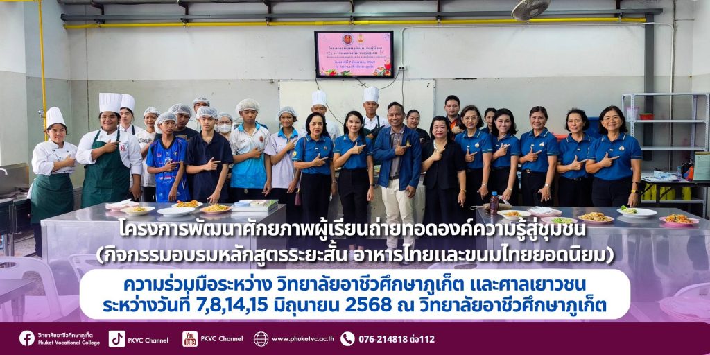 งานพัฒนาหลักสูตรวิชาชีพระยะสั้น วิทยาลัยอาชีวศึกษาภูเก็ต จัดโครงการ“พัฒนาศักยภาพผู้เรียน ถ่ายทอดองค์ความรู้สู่ชุมชน” กิจกรรมอบรม หลักสูตรระยะสั้น อาหารไทย & ขนมไทยยอดนิยม ความร่วมมือระหว่างวิทยาลัยอาชีวศึกษาภูเก็ต และ ศาลเยาวชนและครอบครัวจังหวัดภูเก็ต จัดอบรมระหว่างวันที่ 7, 8, 14 และ 15 มิถุนายน 2568 ณ วิทยาลัยอาชีวศึกษาภูเก็ต