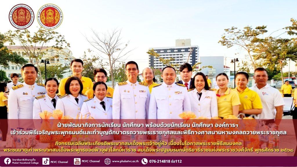วันอังคารที่ 14 มกราคม 2586 นายเทพบัณฑิต สิงคีบับพา รองผู้อำนวยการฝ่ายพัฒนากิจการนักเรียน นักศึกษา วิทยาลัยอาชีวศึกษาภูเก็ต พร้อมด้วยบุคลากรของวิทยาลัยฯ ร่วมพิธีเจริญพระพุทธมนต์และทำบุญตักบาตรถวายพระราชกุศลและพิธีทางศาสนามหามงคลถวายพระราชกุศล เนื่องด้วยพระบาทสมเด็จพระเจ้าอยู่หัวทรงเจริญพระชนมายุ ๒๖,๔๖๙ วันในวันอังคารที่ ๑๔ มกราคม ๒๕๖๘ เป็นวันสมมงคลพระชนมายุเท่าพระบาทสมเด็จพระพุทธยอดฟ้าจุฬาโลกมหาราช ณ ศาลากลางจังหวัดภูเก็ต